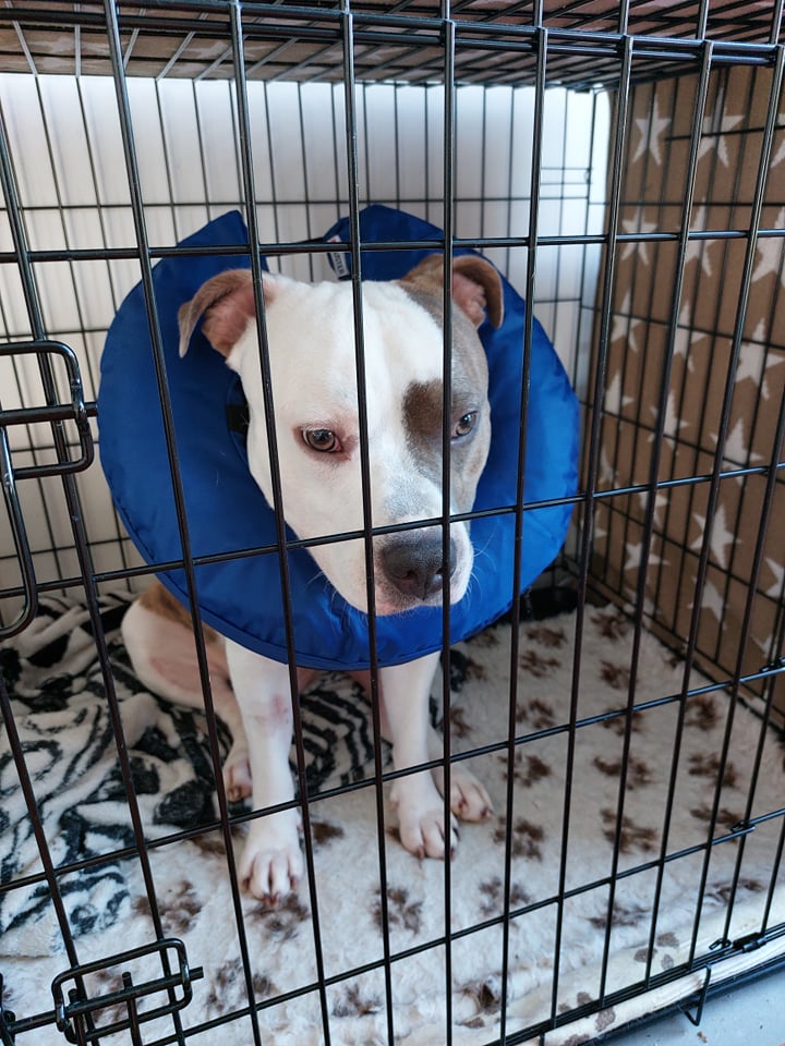 De rest van de dag slaapt Jax veel en het is duidelijk dat hij zich niet goed voelt. De plastic kap is echt geen succes. ’s Avonds begint er, zoals al gezegd door de dierenarts, inderdaad wondvocht te lekken uit de wonde. We deppen het op maar het blijft maar komen. Het lijkt nu zelfs alsof zijn poot nog dikker is dan namiddag. Is dit wel normaal? Om half 12 ’s avonds bellen we opnieuw naar de dierenarts, die ons gerust stelt. Die nacht slapen we enorm slecht op onze matras naast hem. Het wondvocht blijft lekken, waardoor ik wakker word met een hele hoop keukenrol naast mijn hoofd… Jax probeert ook de hele tijd aan de wonde te zitten en de plastic kap is niet echt een optie. ’s Morgens ga ik meteen een beschermingskraag in de vorm van een donut halen, want we kunnen nu niet meer riskeren dat hij nog aan de wonde komt. ‘The cone of shame’ is een feit! Gelukkig doet Jax er niet te moeilijk over. Voor een hond is een beschermingskraag sowieso niet zo comfortabel, maar voor de baasjes ook niet: Jax snurkt echt vreselijk als hij dit aan heeft, dus goed slapen de komende dagen is een illusie!