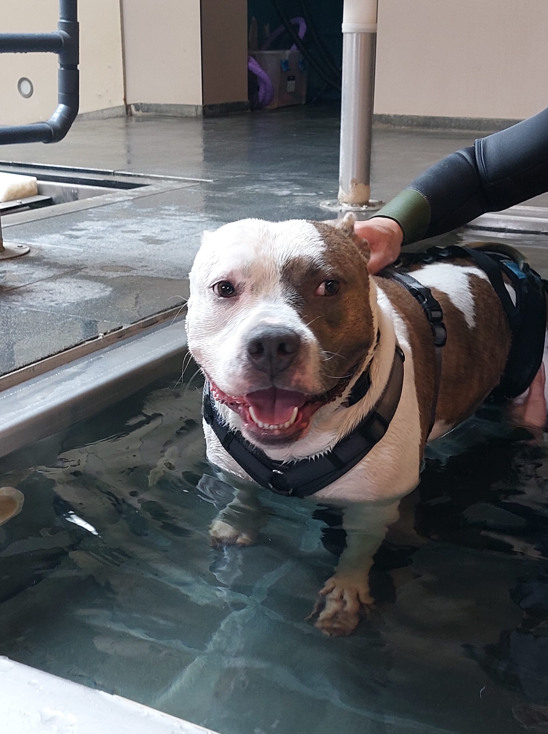 Half mei: We zijn bijna 3 weken verder en Jax moet nog 1 dag ontstekingsremmers nemen. Sinds een aantal dagen merken we een duidelijke verbetering. Jax mankt niet meer, ook niet na het slapen of als hij hard getrokken heeft. Ook de nieuwe fysio in het Waterhof heeft de indruk dat het niet gaat om een meniscusscheur, omdat ze verwachtten dat hij dan toch sterker zou reageren op de manipulaties. Wat ze echter wel opmerken, is dat Jax een enorm steile achterstand heeft (wat ook typerend is voor dit ras), dat hij nog vrij onstabiel staat op zijn poot, en dat hij ook zijn achterpoten kan overstrekken (zoals sommige mensen dit kunnen met hun knieën of ellebogen). Dit maakt hem erg gevoelig voor overbelastingen en ontstekingen. Om te vermijden dat dit opnieuw gebeurt, is het belangrijk om zijn spieren goed op te bouwen met fysio en hydrotherapie, en om hem te leren om zijn poot goed te gebruiken en niet steeds te overstrekken. Als stafford zijnde, is Jax natuurlijk al een sterke beer, maar doordat hij dit al op zo een jonge leeftijd heeft meegemaakt, heeft hij nog niet de spieren kunnen opbouwen van een hond die een aantal jaar ouder is. Als hij meer spieren heeft rond het gewricht, gaat dit hem ook helpen om meer stabiliteit te hebben en zo minder kans te hebben op toekomstige overbelastingen of ontstekingen. Dit lijkt logisch en we gaan dan ook akkoord om de komende tijd te werken aan de spieropbouw door middel van onder andere hydrotherapie.