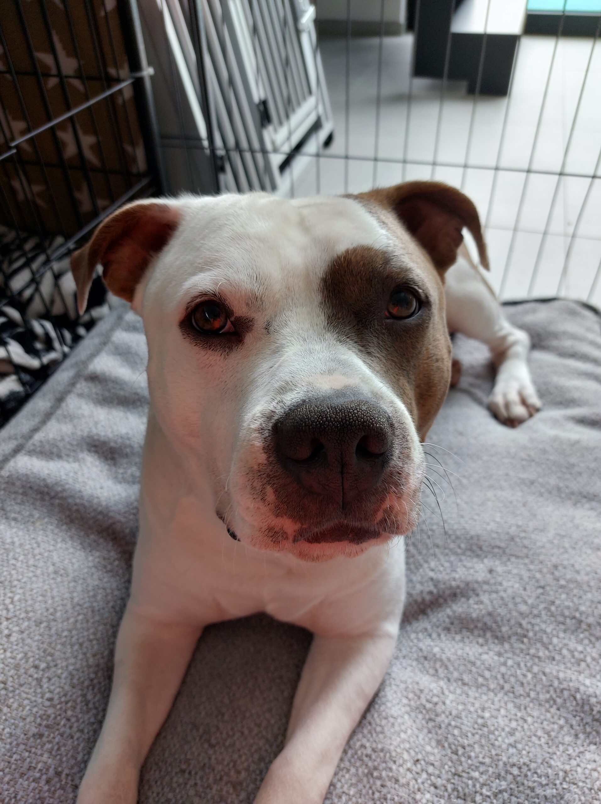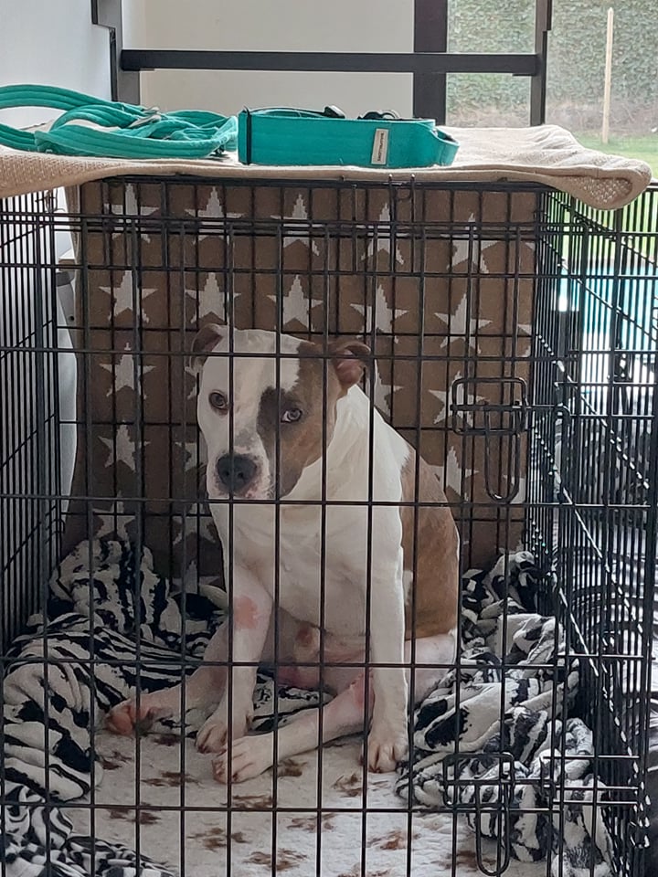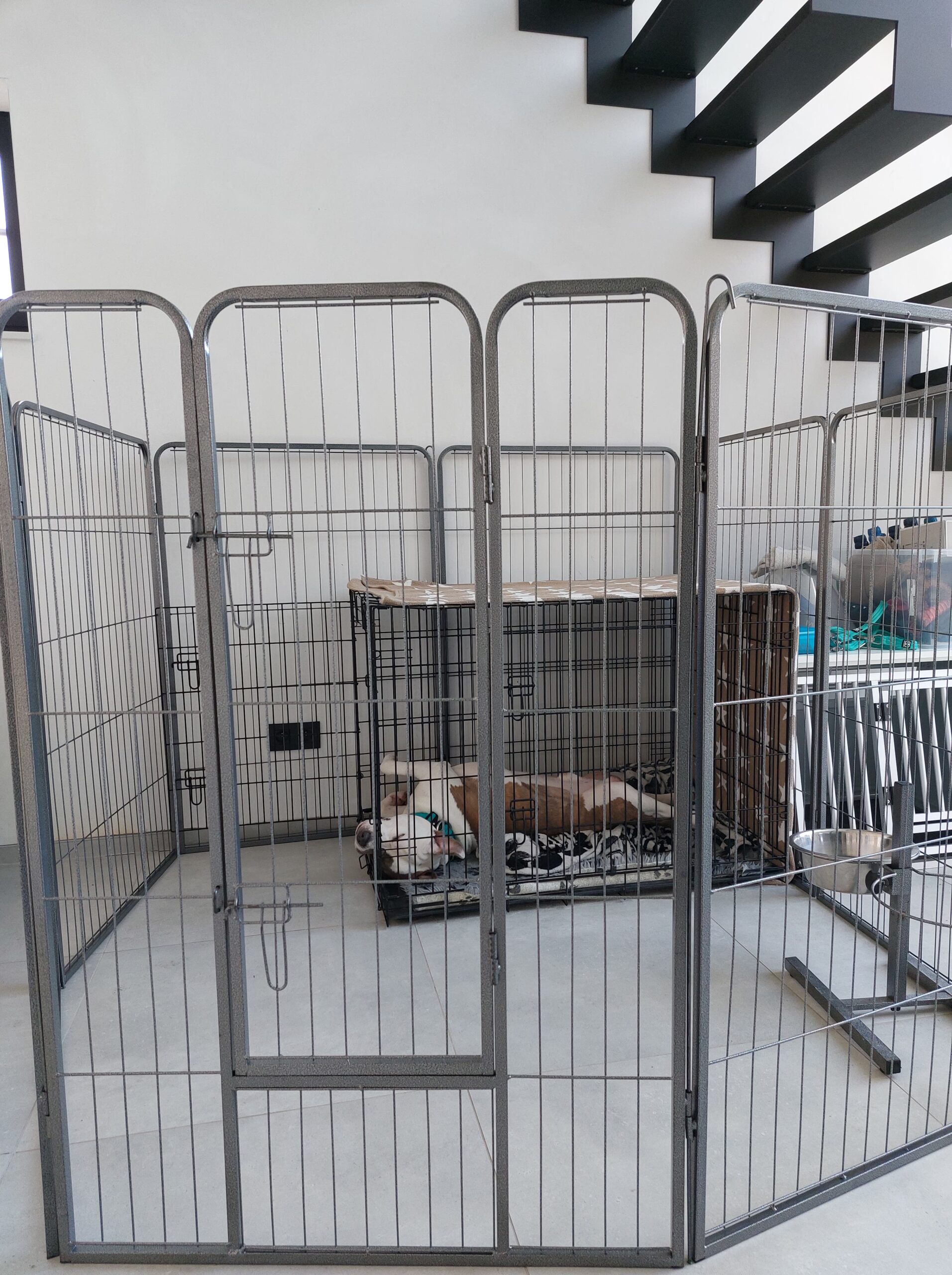 De rest van maart verloopt opnieuw rustig. We bouwen de wandelingen volgens het schema van de orthopeed op met 5 minuten per week. We doen een aantal sessies fysio- en hydrotherapie, wat ook een fijne afwisseling is met de saaie dagen in huis. Ik tel nog meer de dagen af, want er beginnen nu wat zonnige dagen te komen en ik zou graag een lange wandeling kunnen doen met hem, maar dat kan nog niet. Na de check-up bij de orthopeed zetten we ook de puppyren op, zodat Jax toch iets meer vrijheid heeft. Als hij toch te wild wordt, zetten we hem even terug in de bench want we blijven voorzichtig. We hebben gekozen voor een ren van 1m20 hoog. Fijn, want daar kan hij zeker niet over (hoewel hij dat eigenlijk ook niet probeert), maar het is niet echt prettig om zoiets in je huis te hebben staan. Ach ja, we laten voorlopig toch nog geen bezoek komen en het is nog maar een aantal weken…