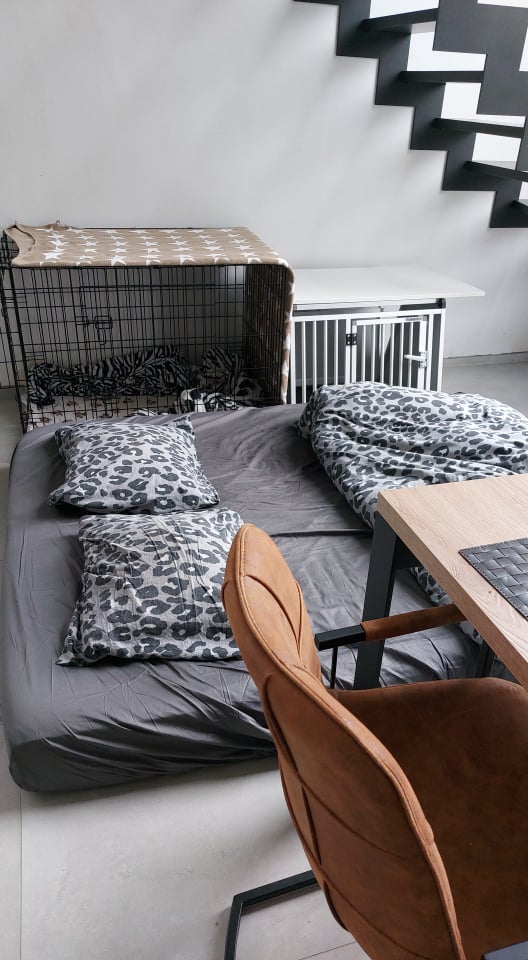 Zoals vorige keer is Jax nog versuft van de narcose en leggen we hem bij thuiskomst meteen in de bench. Na een tijdje begint het piepen weer en vindt Jax nog niet meteen een comfortabele houding. Hoewel we dit nog steeds zielig vinden, is het anders dan de vorige keer omdat we wisten dat dit ging gebeuren en ook weten dat dit morgen ergens in de loop van de dag wel weer beter zal gaan. Onze matras ligt al klaar naast zijn bench zodat hij ’s nachts niet alleen moet zijn.