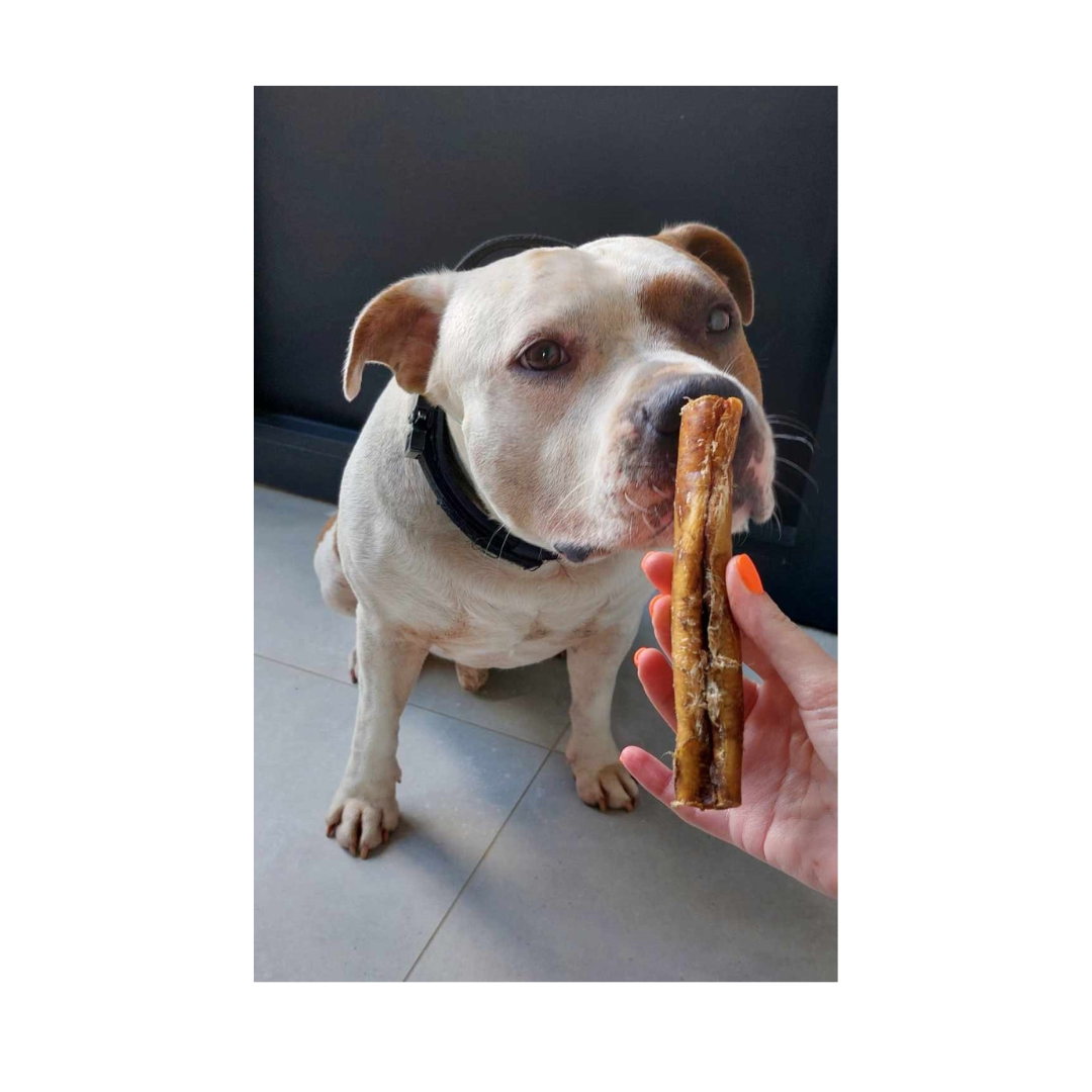 Bullepees is een stick voor je hond waar ze lekker op kunnen knagen. De bullepezen worden op lage temperatuur gedroogd, waardoor alle voedingsstoffen en vleessmaak bewaard blijven. Deze snack is rijk aan eiwittten en laag in vetgehalte. Kauwen is daarnaast ook goed voor je hond om tandplak te verwijderen en versterkt de kauwspieren.