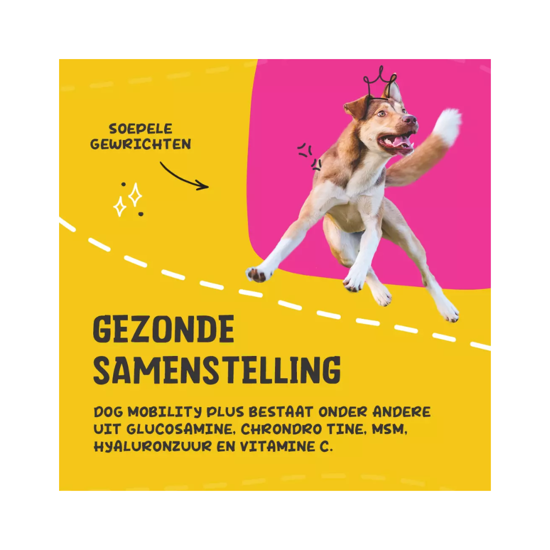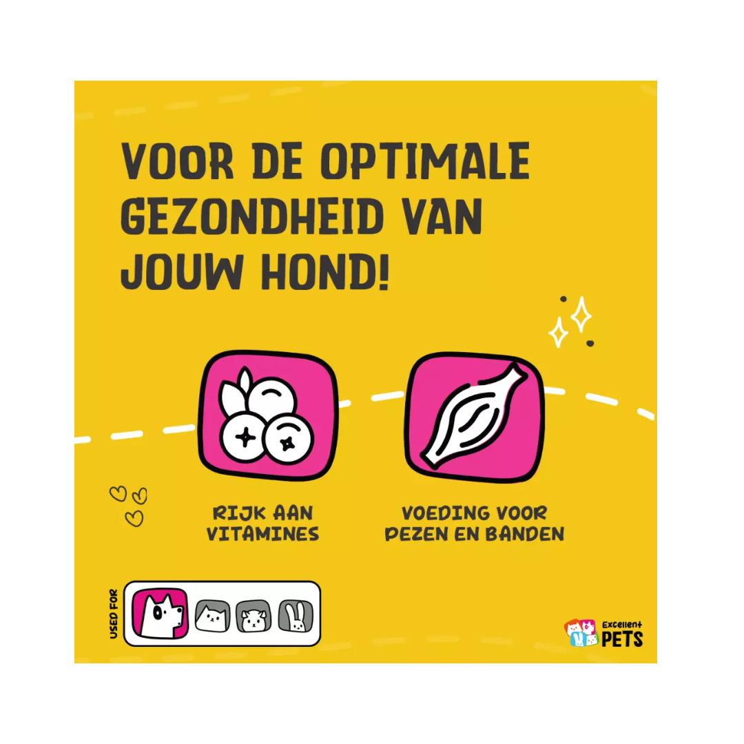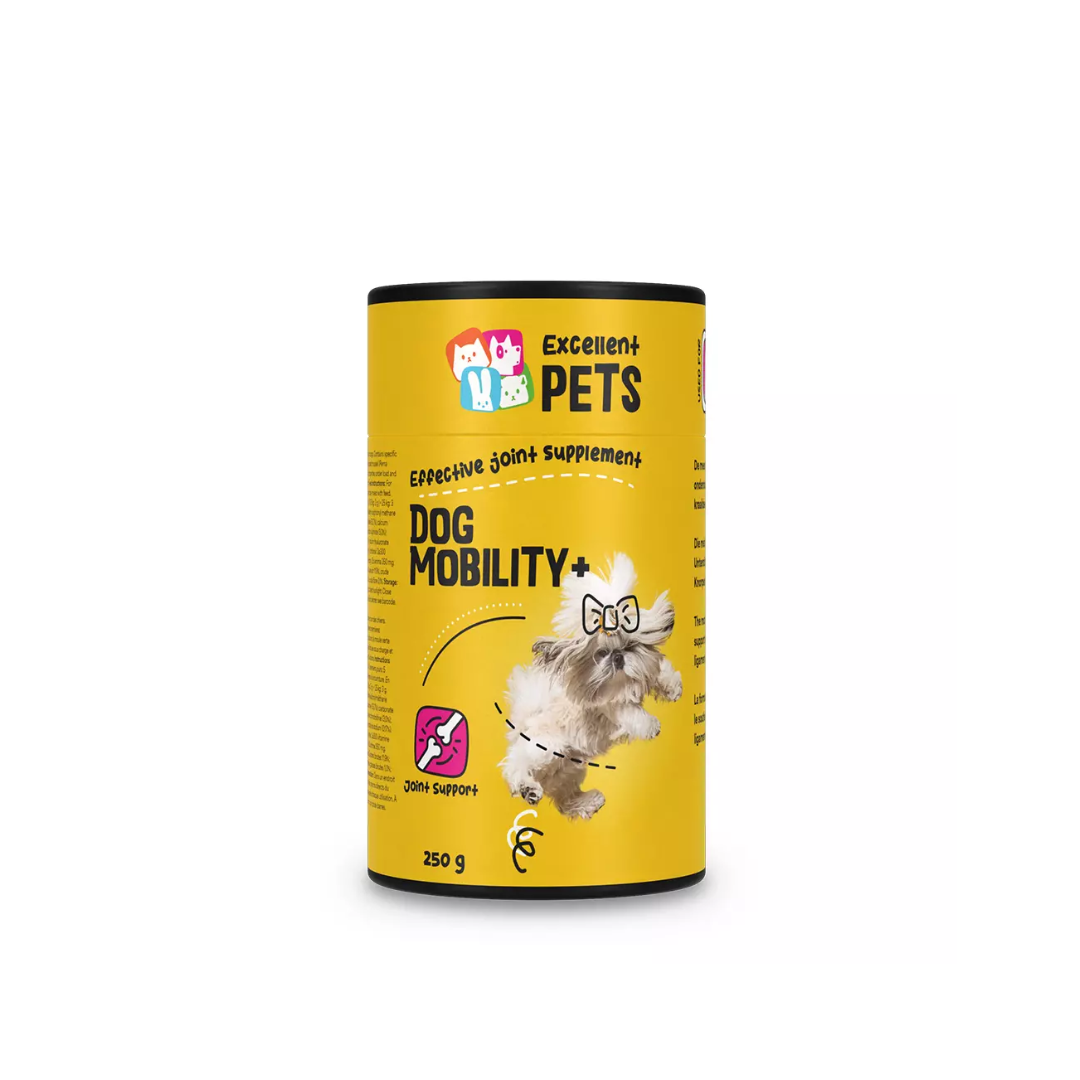 Dog Mobility Plus Poeder van Excellent Pets is de meest complete formule voor de ondersteuning van pezen, kraakbeen, banden en gewrichten van je hond. Dit supplement bevat onder andere MSM, glucosamine, chondroïtine, groenlipmossel, hyaluronzuur en vitamine C. Elk van deze ingrediënten dragen bij aan goede gezondheid van het bewegingsapparaat van je hond.