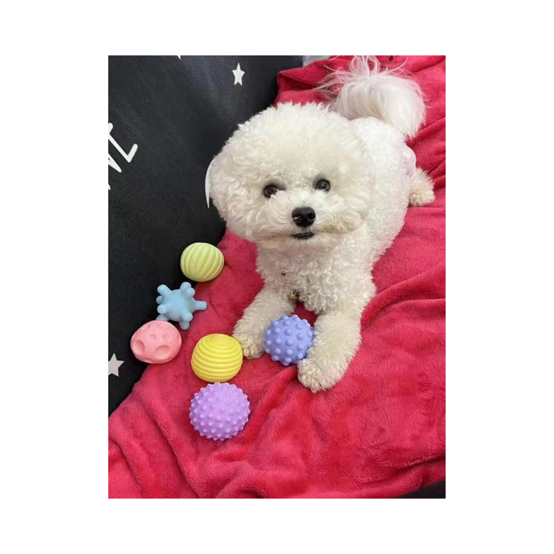 De Doggotique Set Puppyballetjes is een 6-delige werpbalset voor onze jonge ontdekkers! Deze set in vrolijke kleuren bevat 6 verschillende ballen, elk met een eigen textuur. Ideaal om je pup of hond te laten ontdekken wat hij het leukste vindt – van zacht stuiteren tot lekker kauwen.