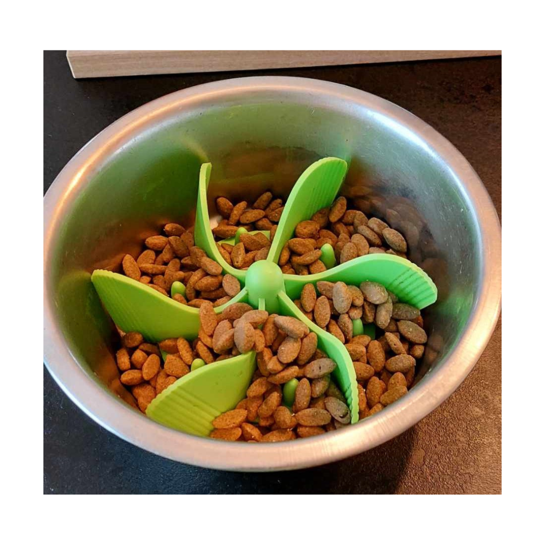 Plaats het inzetstuk in de voerbak van je hond en druk deze aan, zodat de zuignapjes zich vastmaken. Knip de flapjes op maat indien nodig. Doe het voer in de eetbak en laat je hond maar smullen.