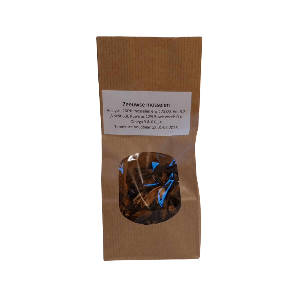 Is jouw hond fan van snacks die uit de zee komen? De Sn’urk Gedroogde Mosseltjes zijn afkomstig van Zeeuwse mosselen die gedroogd zijn in Urk. Vis en zeevruchten zijn rijk aan omega-vetzuren en eiwitten en dragen bij aan een gezonde vacht en soepele gewrichten. Ze bevatten weinig vetten, waardoor ze ook geschikt zijn voor honden met (een neiging tot) overgewicht.