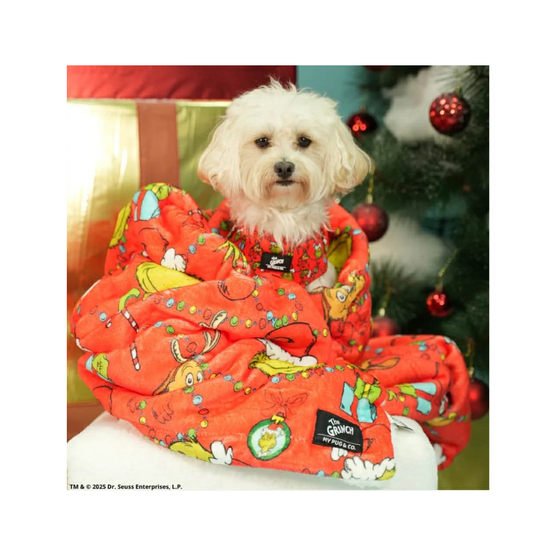 Leg de Hondendeken My Pug & Co – The Grinch Rood in de zetel, mand of bench. Let op dat je hond de deken niet begint te slopen.
