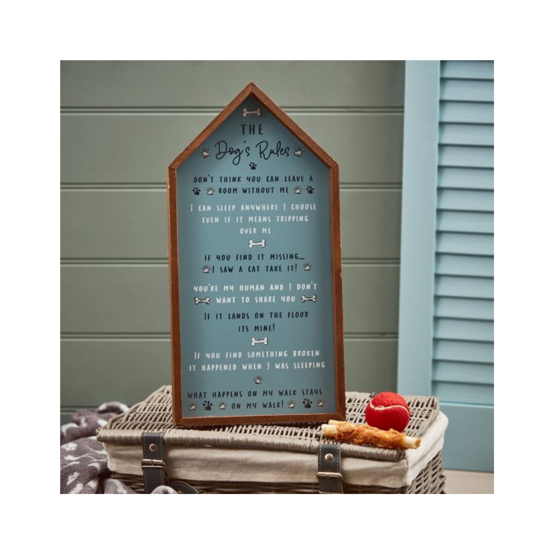 Het Houten Huisje met Hondenregels is een charmante blikvanger in je interieur als hondenliefhebber. Dit houten bord in de vorm van een huisje beschrijft de regels die jouw hond heeft opgesteld (Engelstalig). De schattige illustraties van hondenbotjes maken het geheel helemaal compleet.