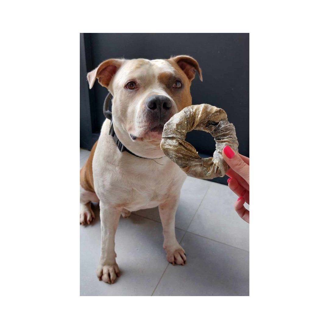 De ringen bestaat voor 100% uit kabeljauw. Ze zijn taai, waardoor je hond er lekker op kan knabbelen.