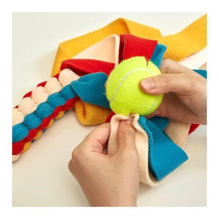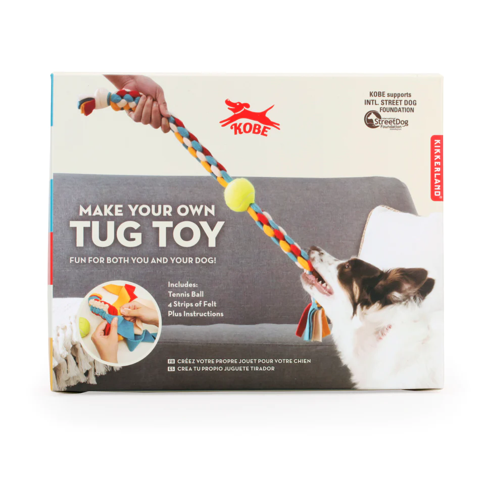 Met de Kobe Make Your Own Tug Toy krijg je een tennisbal met gaten en 4 lange lappen fleece-stof in 4 kleuren (geel, blauw, wit en rood). Maak je eigen trekspeeltje door de lappen fleece te vlechten en door de tennisbal te trekken. Je kan dit op verschillende manieren vlechten en de tennisbal op verschillende plaatsen steken. Inclusief instructieboekje om je te helpen om het speeltje te maken.