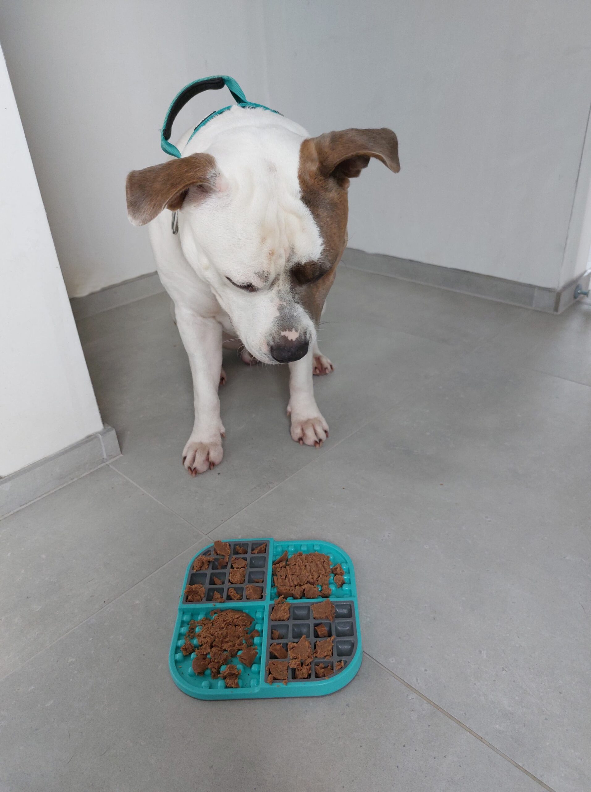 Wij gebruiken de LickiMat vooral bij het avondeten, maar soms ook tussendoor als mentale stimulatie. Hou er rekening mee dat je hond bij natvoer, vers vlees of vloeibare pasta’s niet netjes binnen de lijntjes van de LickiMat gaat eten!