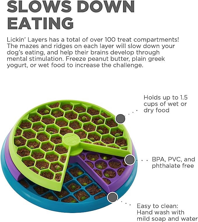 In tegenstelling tot veel gangbare intelligentiespellen waar je de beloningen onder kegels, schuifjes en dergelijke steekt, is dit echter ook een likmat waar je zowel vaste als vloeibare snacks in kan doen. Nog leuker is het om een combinatie van beide in de Lickin’ Layers te verstoppen!