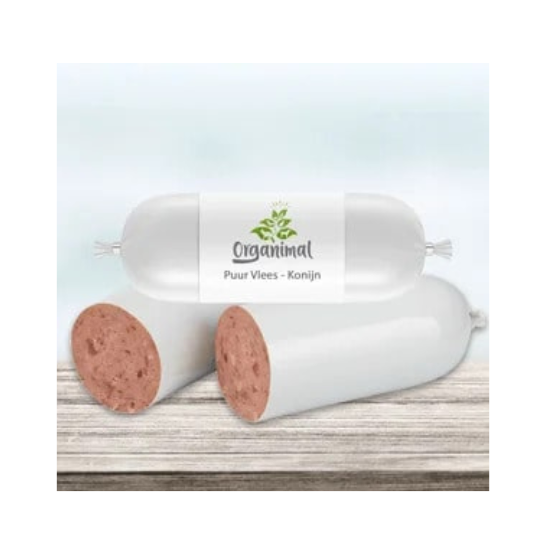 De Organimal Gestoomde Worst Konijn is een houdbare vleesworst die bestaat uit één diersoort en vrij is van chemische geur-, kleur- of smaakstoffen. Deze vers vlees voeding moet, in tegenstelling tot KVV, ongeopend niet in de diepvries of de koelkast bewaard worden. Ongeopend zijn deze worsten ook lang houdbaar.