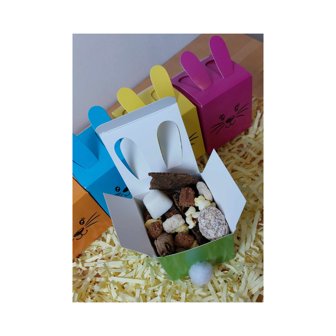 Op zoek naar een kleine Paasverrassing voor je hond? Deze vrolijke Paashaas Mini Box zit boordevol kleine natuurlijke snackjes en trainers uit ons eigen assortiment. Elk doosje is een verrassing en kan een verschillende inhoud hebben, afhankelijk van onze voorraad op dat moment. Sowieso bevat elk doosje een mengeling van verschillende vleessoorten, vis of schaaldieren en veggie snacks. Op die manier kan jouw hond nieuwe smaken proeven én je kan je hond tijdens Pasen even extra verwennen.