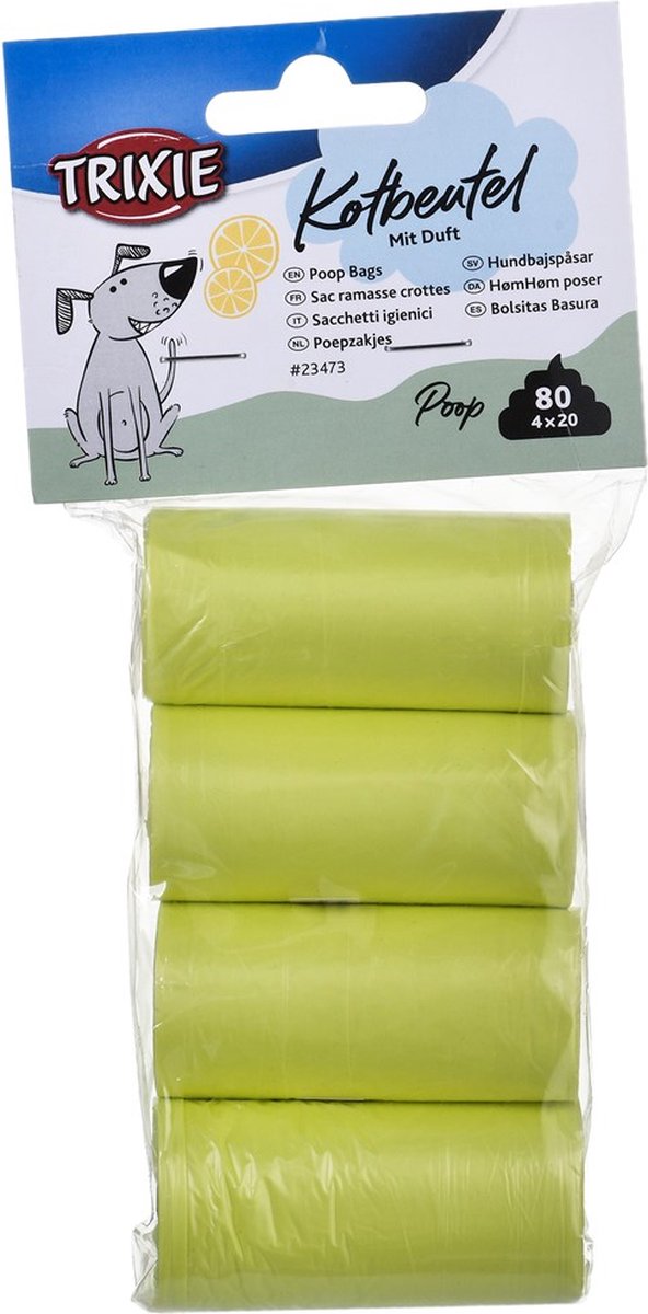 De Trixie Poepzakjes zijn gemaakt van plastic en bestaat uit 4 rollen van elk 20 poepzakjes. Deze rollen passen in alle poepzakhouders.