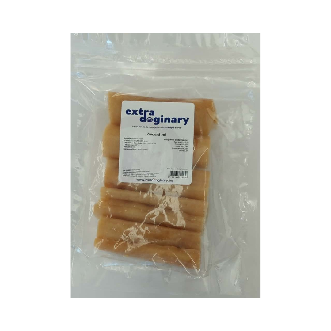 De Varkenszwoerd Rol bestaat uit stukken van ca. 10-15 cm om lekker op te knabbelen! Zwoerd is de buitenste harde huidlaag die aan het spek van het varken vastzit. De varkenszwoerden worden eerst gedroogd. Daarna worden ze gefrituurd in varkenstalg, zodat ze knapperig worden en hun goudbruine kleur verkrijgen. De zwoerden zijn vrij taai, waardoor je hond er lekker op kan kauwen.