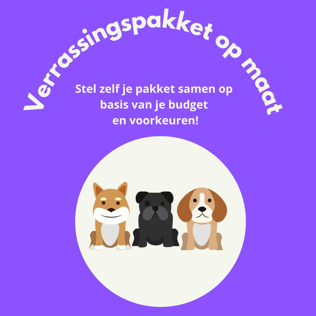 Kies een budget dat jij wil besteden, beantwoord een aantal gegevens over je hond en geef wat voorkeuren door voor snacks en speeltjes. Wij gaan hiermee aan de slag en maken een leuk pakketje op maat van jouw hond! Enkel snacks, met een knuffel erbij, een likmat, snuffelspeeltje of net niet? Jij bepaalt!